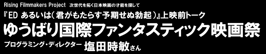 お集まりいただきありがとうございます。映画評論家の塩田と申します。『ED あるいは(君がもたらす予期せぬ勃起)』。いかにも、国立映画アーカイブで上映していいのかなというタイトルですが、非常にゆうばり国際ファンタスティック映画祭らしい作品・タイトルだと思います。来年で(映画祭が始まってから)30年が経ちますので、このシアターコンペ(ファンタスティック・オフシアター・コンペティション)自体が、いろいろと性格が変わってきて、初期と今とは全然違うんです。今の形に落ち着いてきたのが、確か1999年のグランプリ作品の、山下敦弘監督の『どんてん生活』。上映後、脚本家の向井康介さんにトークで登壇していただきますが、向井脚本家も、ゆうばりが輩出したのかなと思います。