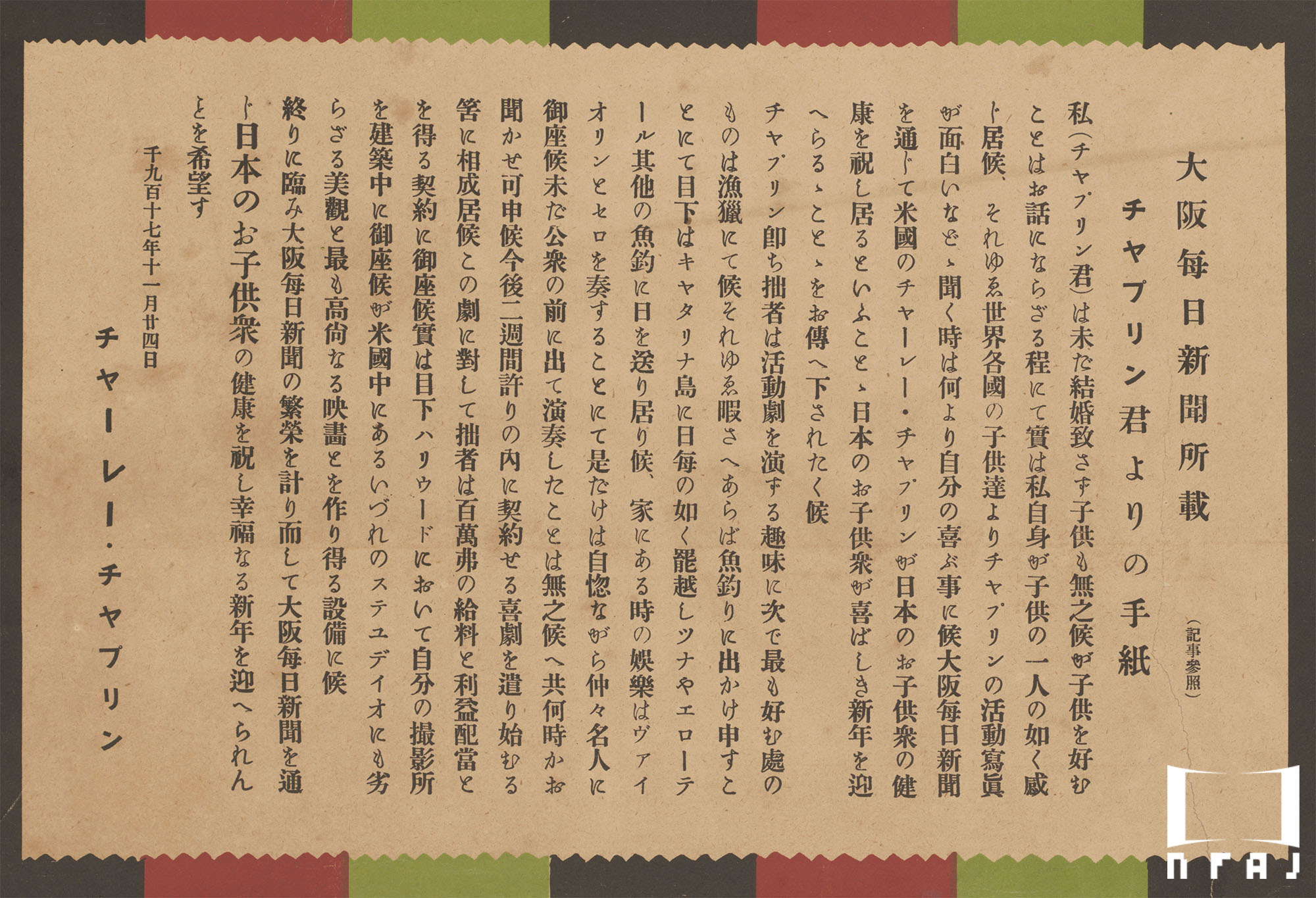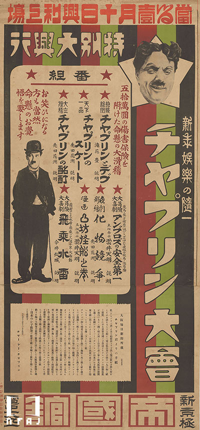 主任弁士の雲井天明は東京・浅草寺の映画弁士塚にも名前が刻まれており、滝花豊はのちの日活女優・滝花久子の父。大阪毎日新聞所載の日本の子どもに向けた「チヤプリン君よりの手紙」の日付が1917年11月24日となっていることから、京都・新京極 帝国館製のこのポスターは、1918年1月10日公開のものと思われる。