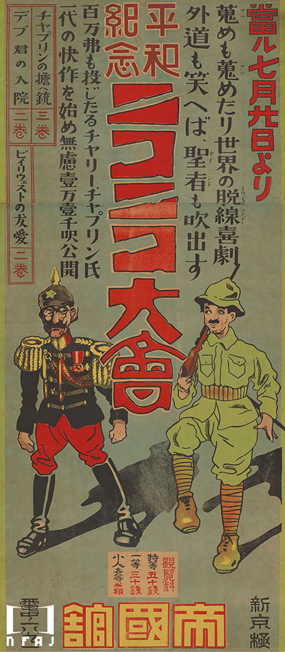 ポスターのタイトルに「平和紀念」とあるのは、世界大戦の終結を祝う意味。併映作はロスコー・アーバックル主演の『デブ君の入院』Good Night Nurse(1918年)と、チャップリンの物真似で名を馳せたビリー・ウェスト主演の『ビリイウェストの友愛/ビリー・ウエストの慈善』His Married Life(1916年)。