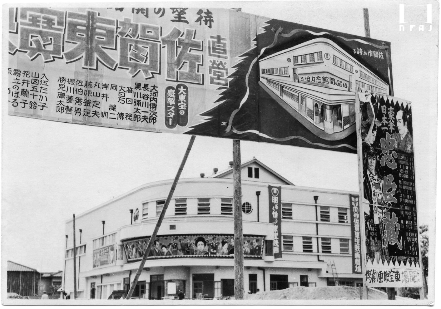開館間近の劇場外観。開場作品は大河内傳次郎・長谷川一夫主演の『忠臣蔵』(1939年、滝沢英輔・山本嘉次郎監督)。