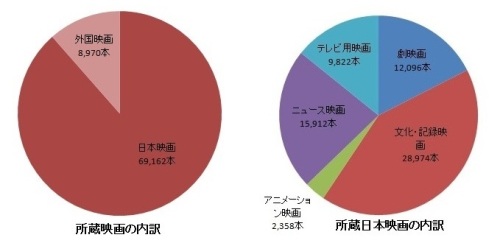 ※ここで言う「本」とは、1つの作品に対し、ジェネレーション(ポジ、ネガ)、形状(35mm、16mm等)、バージョン(再編集版、字幕付きプリント等)、完全度において異なるフィルムを1つずつ数えた場合の単位を指しています。つまり、1つの作品に対して複数本のフィルムが存在していることがあります。
