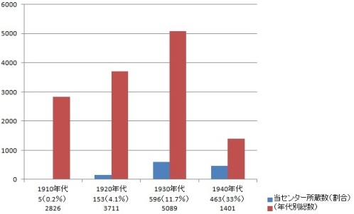 この6,728作品は、1910年から2015年までに公開された日本劇映画の総数37,233作品の18.1%にあたります。戦前期、特に無声映画作品の残存率は、欧米諸国のそれと比べてきわめて少ないです。当館所蔵の作品数で計算した場合、年代別に0.2%(1910年代)、4.1%(1920年代)、11.7%(1930年代)、33%(1940年代)となります。