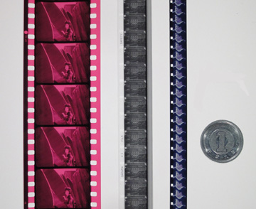 左から、35mm、16mm、8mmフィルムと1円玉(直径20mm) - Q: 映画フィルムはもう作られないとニュースで聞いた気がするのですが。