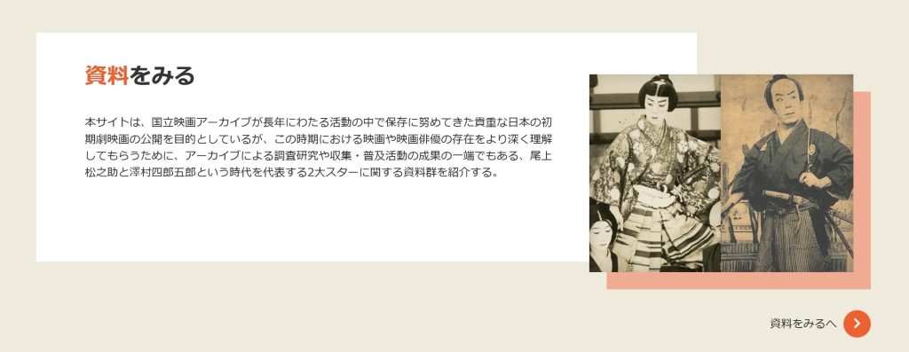 当時の映画界を牽引した2大スター、尾上松之助と澤村四郎五郎に関する資料類を紹介します。松之助については、2007年に発行したブックレット「尾上松之助―日本最古の映画スター“目玉の松ちゃん”のすべて」所収の講演録、ポスター類、フィルモグラフィーなどを、ネット初公開いたします。四郎五郎については2023年10月に行ったイベントの講演記録を掲載するとともに、写真や新たに作成したフィルモグラフィーを公開いたします。