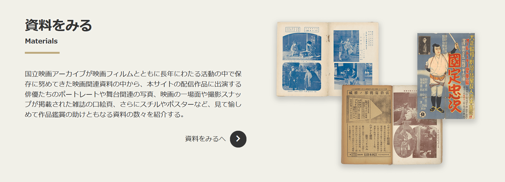 国立映画アーカイブが長年にわたる活動の中で保存に努めてきた映画関連資料の中から、本サイトの配信作品に出演する俳優たちのポートレートや舞台関連の写真、映画の一場面や撮影スナップが掲載された雑誌の口絵頁、さらにスチルやポスターなどを紹介します。